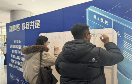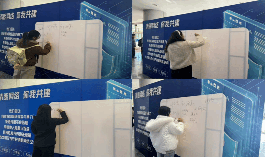 活动现场,印着“清朗网络,你我共建”醒目口号的蓝色展板格外引人注目,成为了全场的核心焦点。参与活动的同学们怀着庄重且认真的态度,郑重地在横幅上签下自己的名字。每一个签名都饱含着大家对维护清朗网络环境的坚定承诺和有力支持,展现出共同为网络文明贡献力量的决心。这一笔一划不仅是对自我行为的承诺,更是对构建美好网络家园责任的担当。