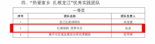 张其同学带领的“红魂绿韵 筑梦尚志”实践团凭借突出表现,荣获“热爱家乡 扎根龙江”优秀实践团队一等奖;