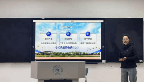 本次培训活动宫颖颖同学以“告别丑哭PPT,从逻辑视觉到效率”为核心主题,采用“理论讲解+案例分析+实操指导”的方式展开从逻辑构建到工具运用逐层深入的讲解。