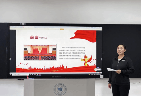 讲座上,安子怡同学从历史维度到实践要求层层递进,重点论述党的二十届四中全会在新时代新征程中的里程碑地位、对国家发展全局的战略指引以及对青年成长的时代召唤等;通过聚焦“十四五”时期发展答卷,系统梳理经济发展、科技创新、民生改善、生态保护等领域的突破性进展与标志性成果;并紧紧围绕“十五五”规划建议,详细解读经济社会发展的目标任务、重点领域布局与重大战略举措;讲座最后,安子怡同学将目光聚焦青年责任担当。深刻阐释当代青年在民族复兴征程中的角色定位、责任使命与实践路径。